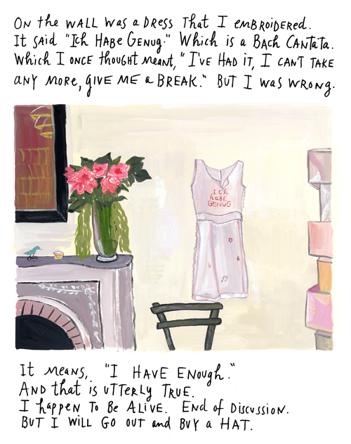 Diese Zeichnung von Maira Kalman, der Witwe des großen Tibor, hatte ich lange an meiner Bürowand (sie stammt aus ihrem hinreißenden gezeichneten Blog in der New York Times), eben habe ich mich daran erinnert. Weil ich heute dasselbe dachte: Ich habe genug. Im obigen Sinn. Ein sehr friedliches Gefühl.