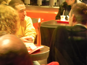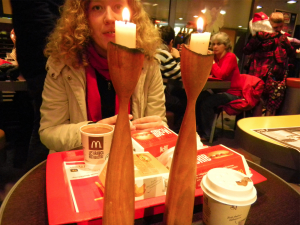 Nur damit mal klar ist, dass hier nicht gemauschelt wird: Das Und tschüß vom 18.12. in seiner neuen Heimat bei McDonald’s, Hamburg Hauptbahnhof. Die Herrschaften, auf deren Tisch ich die beiden Leuchter gestellt habe, haben sofort einen davon an den Nebentisch abgegeben, wie ich von draußen beobachtete. Das ist der richtige Geist, danke.