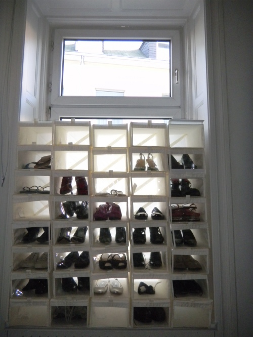 Auf vielfachen Wunsch einer einzelnen Dame: mein Schuhfenster. Halbtransparente Ikea-Schuhboxen im Schrankzimmer meiner Hamburger Wohnung, milde von hinten beschienen. Spart den Vorhang, macht Freude am Morgen. Ein Kirchenfenster für Frauen. Nicht täuschen lassen von den leeren Schachteln: Der Rest der Schuhe wohnt in München. Plus noch ein paar mehr…