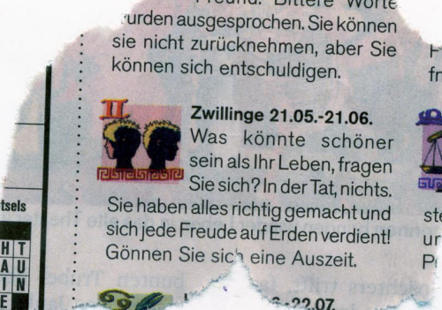 Ich habe also Eltern, die morgens am Frühstückstisch nach meinem Horoskop in der Zeitung schauen, dann den Scanner anwerfen, den Mac hochfahren und das Horoskop rübermailen. Mein Vater ist übrigens 84. Wirklich wahr, schöner kann das Leben nicht sein.