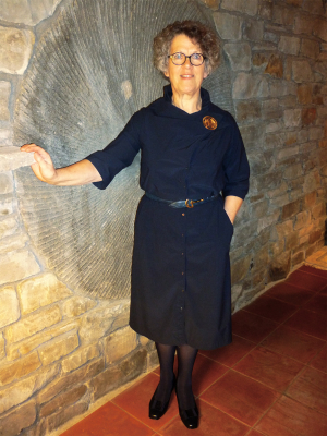 Das kleine Blaue lebt, und wie! Sibylle Lenz, die neue Besitzerin von Nummer Zwo, hat ein Foto geschickt. Großartig: Sie hat den Kragen asymmetrisch mit einer Brosche fixiert – eine Lösung, die mir in 365 Tagen nicht eingefallen ist. Toll!